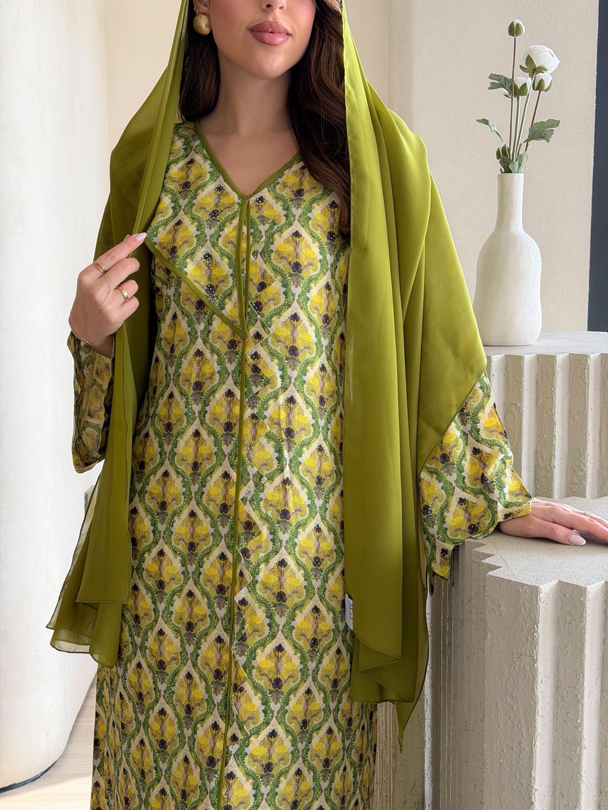 جلابية قطن مغسولة قبل الخياطة بالدانتيل الفرنسي والشيله
