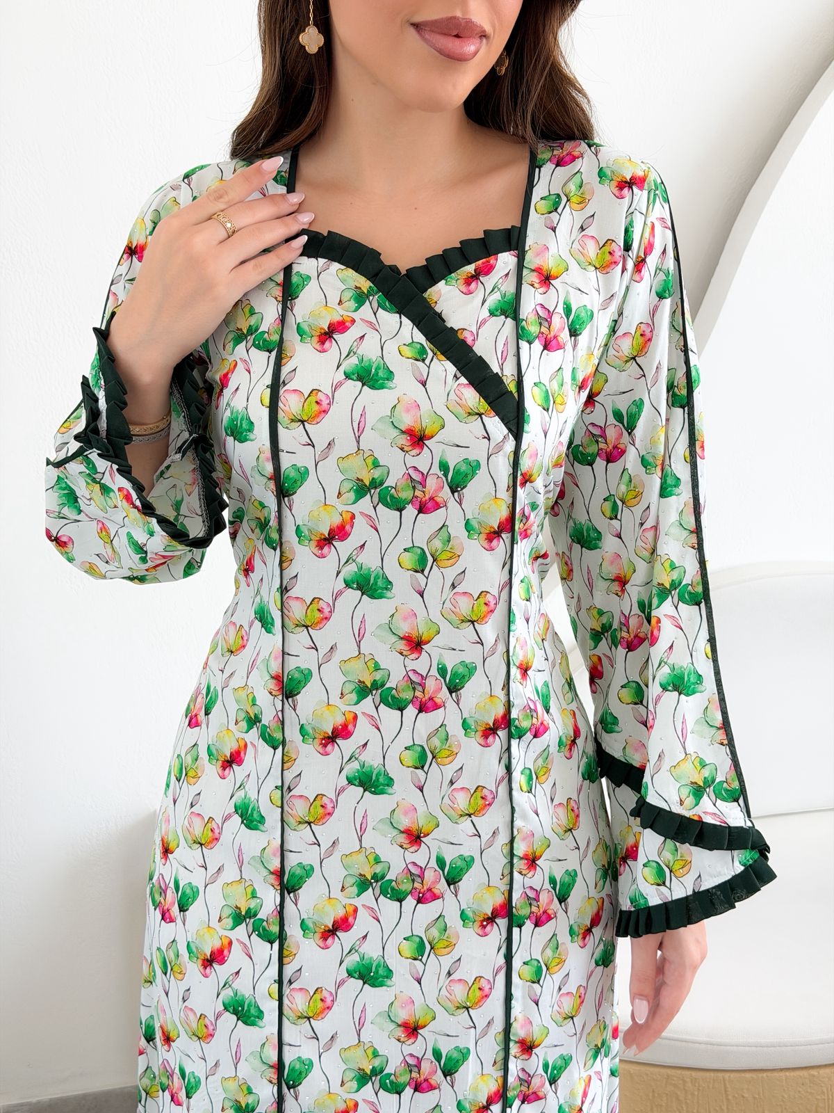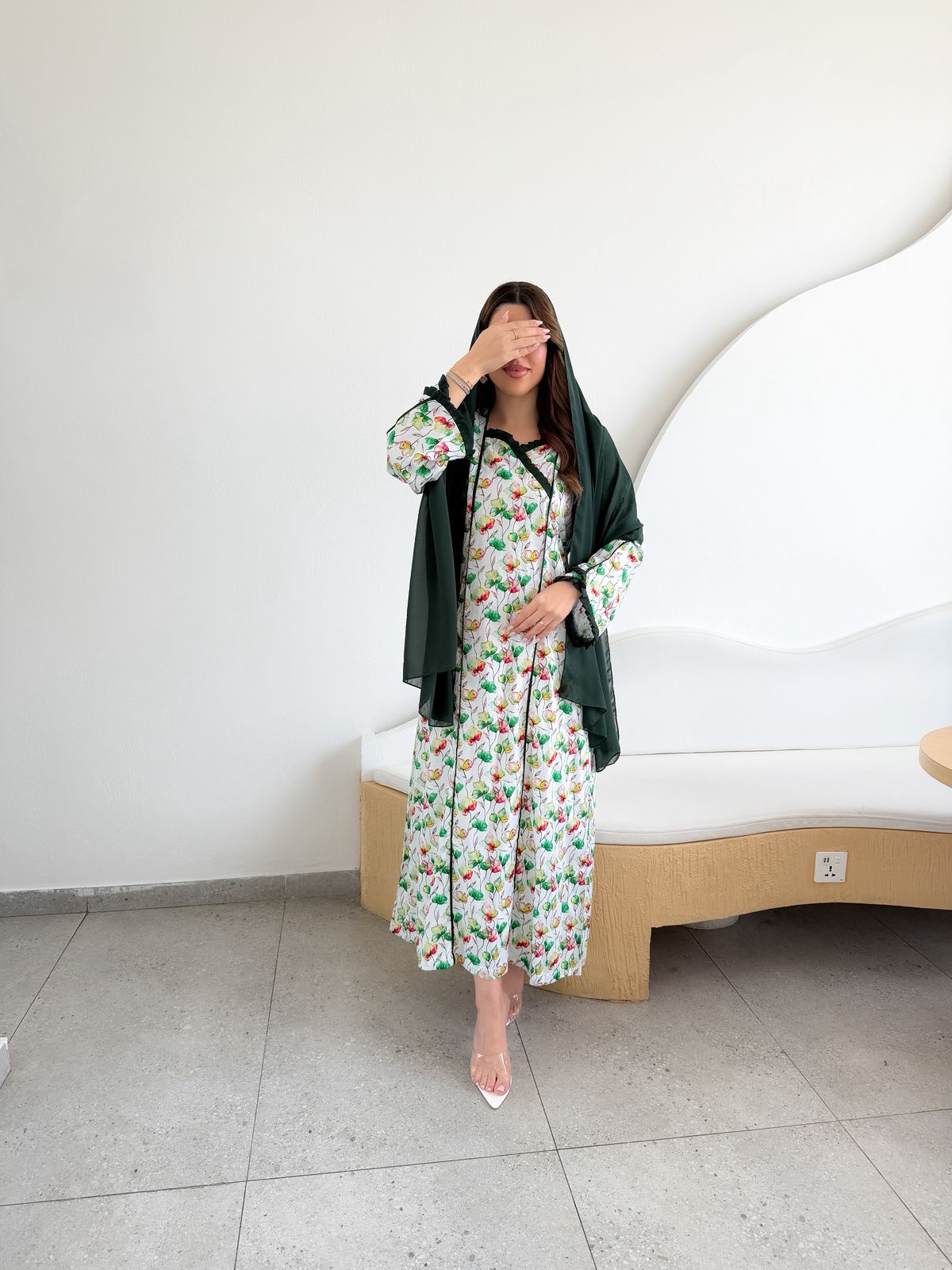 جلابية قطن مغسولة قبل الخياطة بالدانتيل الفرنسي والشيله